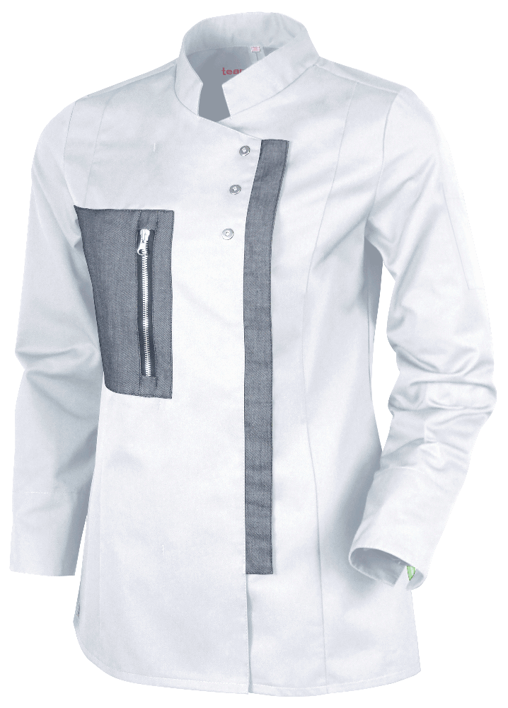 Col montant, languette à l’arrière pour fixer les bretelles de la cotte; Boutons pression sous patte; 1 poche de poitrine avec fermeture éclair; 1 poche de manche avec compartiment stylo; Manches avec revers - SUPPORTING FAIRTRADE COTTON