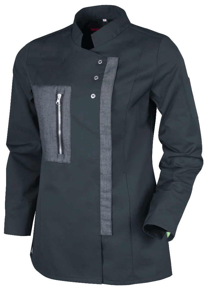 Col montant, languette à l’arrière pour fixer les bretelles de la cotte; Boutons pression sous patte; 1 poche de poitrine avec fermeture éclair; 1 poche de manche avec compartiment stylo; Manches avec revers - SUPPORTING FAIRTRADE COTTON