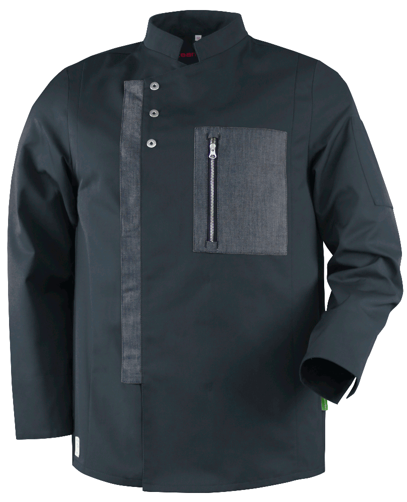 Col montant, languette à l’arrière pour fixer les bretelles de la cotte; Boutons pression sous patte; 1 poche de poitrine avec fermeture éclair; 1 poche de manche avec compartiment stylo; Manches avec revers - SUPPORTING FAIRTRADE COTTON