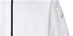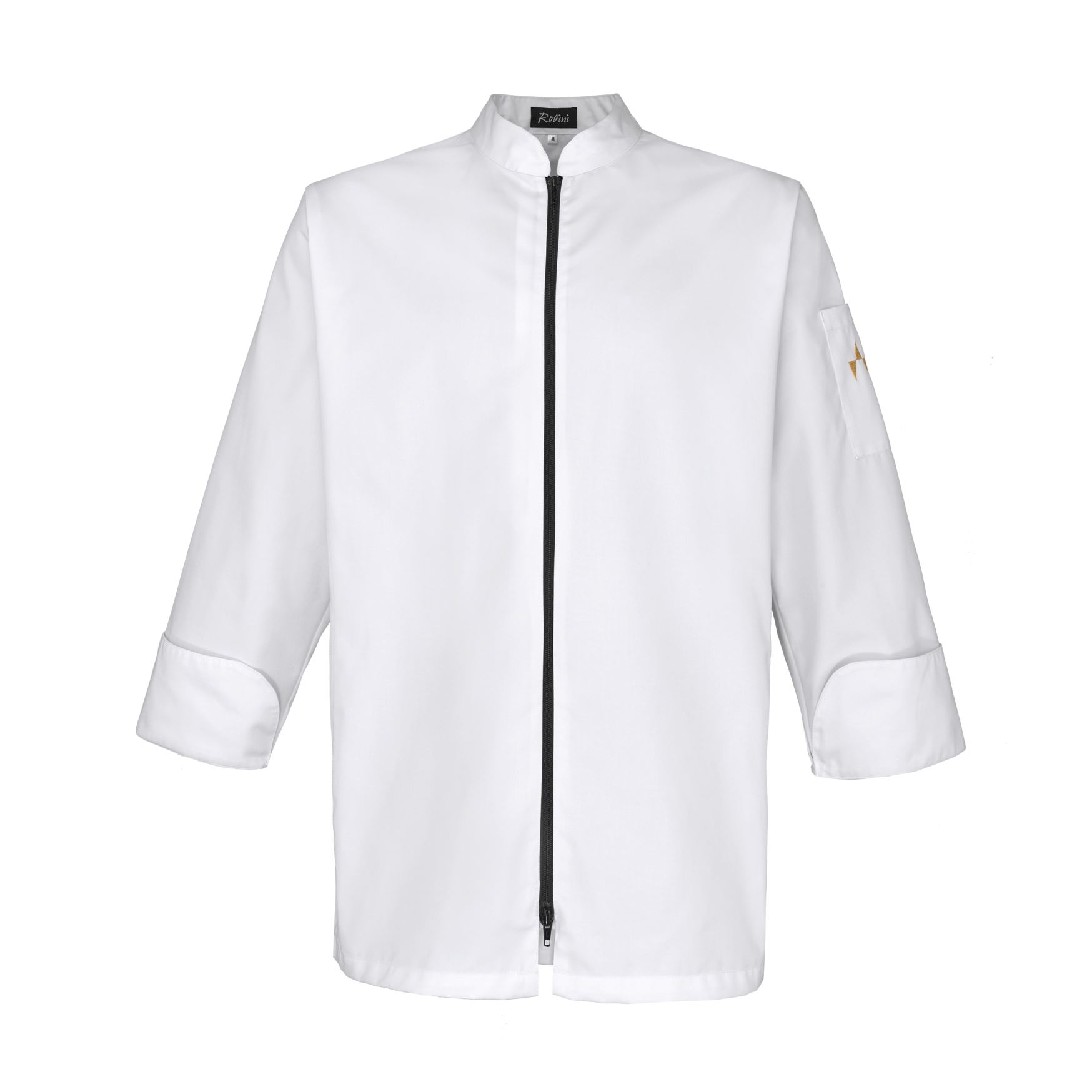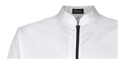 Veste de cuisinier avec fermeture au milleu, slimfit fermeture à glissière noir, manches longues avec manchettes à revers et poche sur manche gauche.