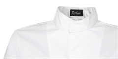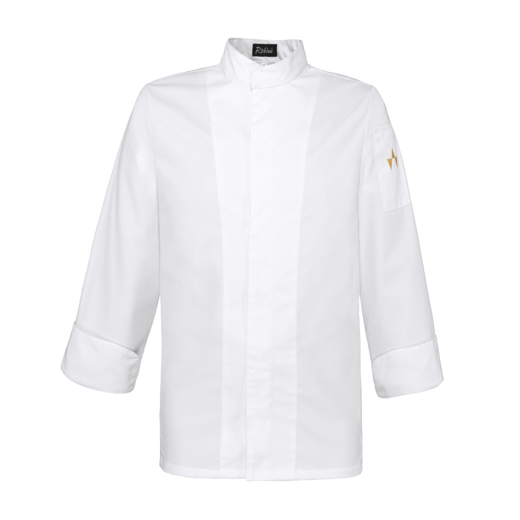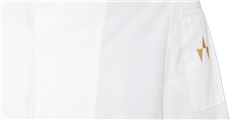 Veste de cuisinier avec fermeture au milleu, extra slimfit, boutons pressions cachés, manches longues avec manchettes à revers et poche sur manche gauche.